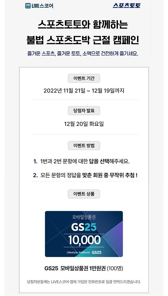 국민체육진흥공단이 발행하는 체육진흥투표권 스포츠토토의 수탁사업자 스포츠토토코리아는 11월 29일 "2022 카타르 월드컵 기간인 지난 21일(월)부터 다음 달 19일(월)까지 라이브스코어와 공동으로 ‘불법스포츠도박 근절 캠페인’을 전개한다"고 밝혔다.