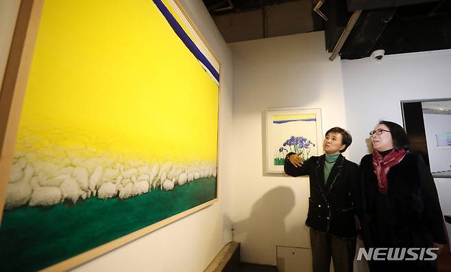 [서울=뉴시스] 추상철 기자 = 이현(오른쪽) 작가와 강금실 지구와사람 대표가 29일 오후 서울 용산구 지구와사람에서 열린 지구와사람 후원을 위한 이현 그림전 '색채유희' 기자간담회에서 작품을 살펴보고 있다. 2022.11.29. scchoo@newsis.com