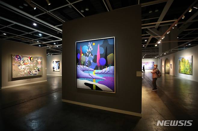 [홍콩=뉴시스] 박진희 기자 = 29일 크리스티 홍콩 프리뷰 전시장인 홍콩 컨벤션 센터(HKCEC)를 찾은 관람객들이 니콜라스 파티의 작품(가운데)을 살펴보고 있다. 크리스티 홍콩은 올해 마지막 경매로 추정가 총 12억~17억 홍콩 달러(한화 약 2040억) 규모의 총 5개 경매를 펼친다. 2022.11.29. pak7130@newsis.com