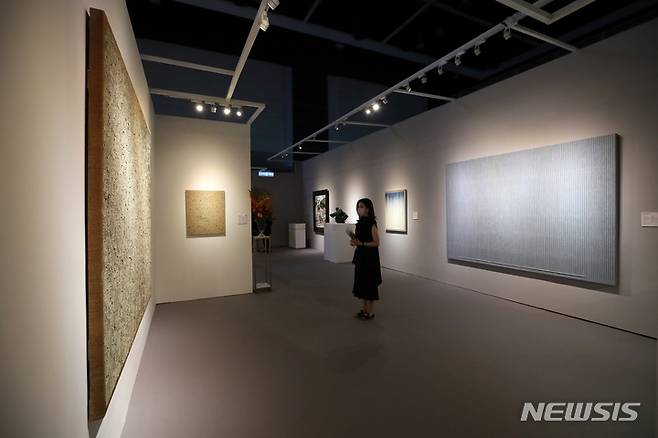 29일 크리스티 홍콩 프리뷰 전시장인 홍콩 컨벤션 센터(HKCEC)를 찾은 관람객이 한국 작가들의 작품을 살펴보고 있다.