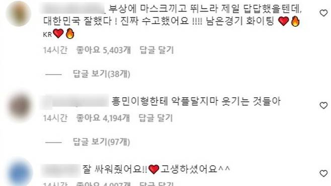이들은 "굳이 찾아와서 악플을 달며 선수 멘털을 흔드냐", "충분히 잘해줬다", "우리 국가대표 자랑스럽다", "끝까지 노력한 국가대표의 모습 기억한다"라며 선수들을 격려했습니다.