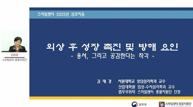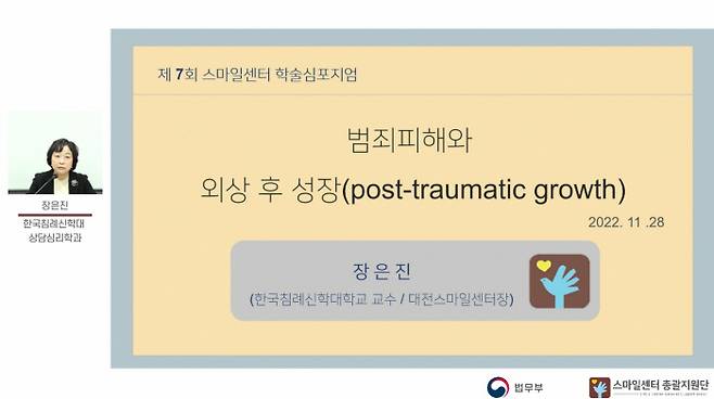 범죄피해자 인권주간을 맞이하여 제7회 스마일센터 심포지엄 <범죄피해 트라우마와 외상 후 성장>이 2022년 11월 28일 오후 2시부터 5시까지 온라인 실시간 스트리밍을 통해 개최되었다. 스마일센터 학술심포지엄은 대중들에게 범죄피해 트라우마의 심각성과 통합적 지원의 필요성을 알리고, 트라우마의 특성에 대해 이해를 돕기 위해 매년 개최되었으며, 이번 학술심포지엄 주제는 <범죄피해 트라우마와 외상 후 성장>으로 <범죄피해와 외상 후 성장>과 <외상 후 성장, 성장 촉진요인과 방해요인>으로 나누어 강연이 진행되었다.
