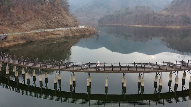 옥천의 명산인 장령산이 병풍처럼 드리워 있고, 광활한 저수지는 하늘을 담아냅니다.