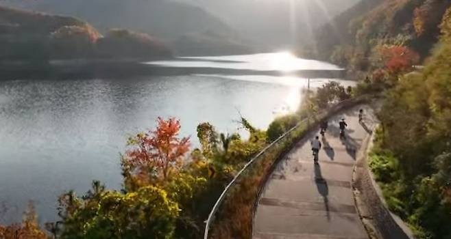 조용했던 마을이 근래 시끌벅적해진 이유는 고래 모양 저수지를 따라 단풍 숲을 달리는 자전거 라이딩이 전파를 타면서입니다.