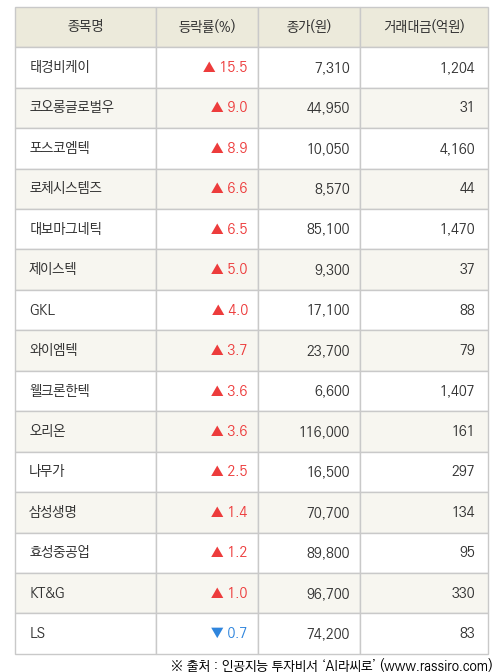 특히 태경비케이는 전 거래일 대비 15.5% 오른 7,310원에 거래를 마감하여 높은 관심을 받았다.