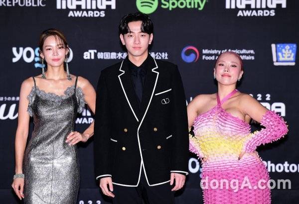 안현모·남윤수·가비가 29일 오후 일본 오사카 교세라 돔에서 열린 ‘2022 MAMA AWARDS(2022 마마 어워즈)’에 참석해 포토타임에 임하고 있다.