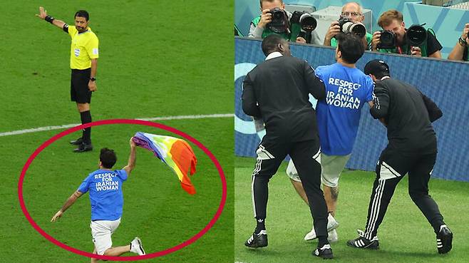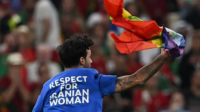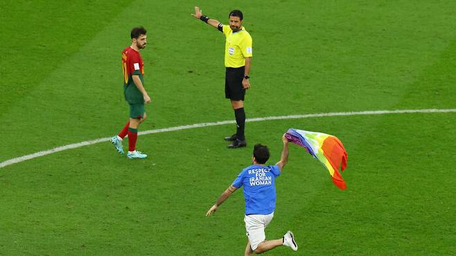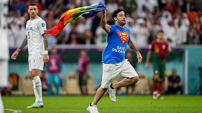 29일(한국 시간) 새벽 4시 카타르 루사일 스타디움에서 열린 월드컵 조별리그 H조 2차전 포르투갈과 우루과이 경기 후반전이 시작된 뒤 몇 분 지나지 않은 시각 갑자기 한 남성이 무지개 문양의 깃발을 들고 경기장으로 뛰어들었습니다.