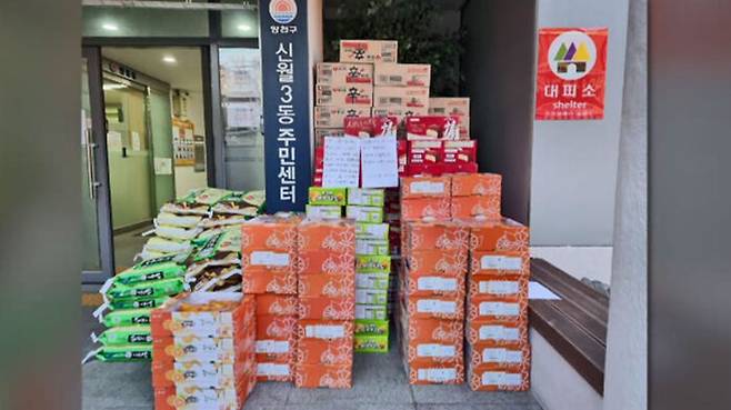 지난 18일 서울 양천구 신월3동 주민센터 현관에 쌀 500킬로그램과 라면 50박스, 귤 50박스와 초코파이 등 300여만 원 상당의 물품이 놓여 있습니다.