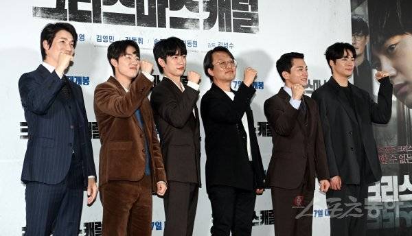 29일 서울 강남구 메가박스 코엑스점에서 열린 영화 ‘크리스마스 캐럴’ 시사회에서 배우 허동원, 송건희, 박진영, 김성수 감독, 김영민, 김동휘가 포토타임을 갖고 있다.