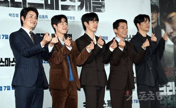 29일 서울 강남구 메가박스 코엑스점에서 열린 영화 ‘크리스마스 캐럴’ 시사회에서 배우 허동원, 송건희, 박진영, 김영민, 김동휘가 포토타임을 갖고 있다.