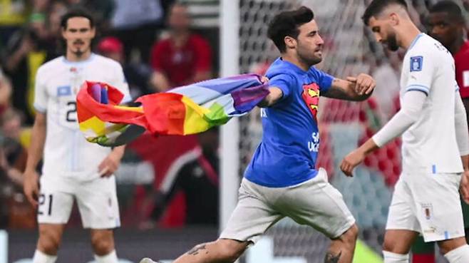 2022 월드컵 조별리그 H조 2차전 포르투갈과 우루과이의 경기 도중 한 남성이 무지개 문양의 깃발을 들고 경기장으로 뛰어드는 일이 벌어졌습니다.