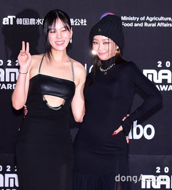 가수 비비·효린이 29일 오후 일본 오사카 교세라 돔에서 열린 ‘2022 MAMA AWARDS(2022 마마 어워즈)’에 참석해 포토타임에 임하고 있다.