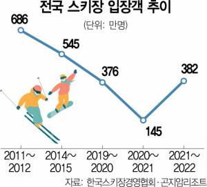 다만 올해 스키장 상황이 녹록지만은 않다. 한국스키장경영협회·곤지암리조트 등에 따르면 전체 스키장 입장객 수는 2011~2012년 686만 명으로 역대 최다를 기록한 후 2012~2013년 631만 명, 2013~2014년 583만 명으로 계속 하락하다가 팬데믹 첫해인 2019~2020년은 376만 명, 2020~2021년은 145만 명까지 떨어졌다. 팬데믹 해소에 2021~2022년 시즌에 382만 명으로 다소 회복됐지만 올겨울은 낙관적이지만은 않다.