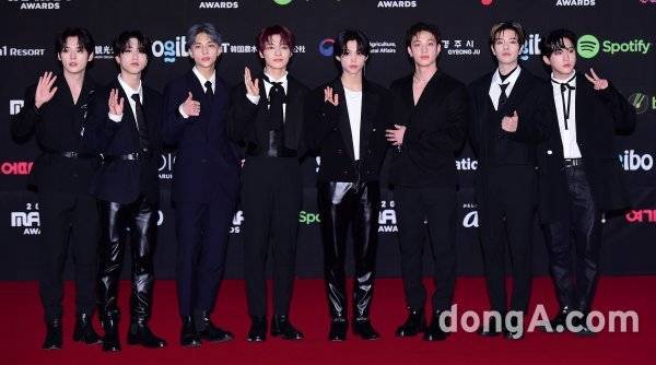 그룹 스트레이 키즈가 29일 오후 일본 오사카 교세라 돔에서 열린 ‘2022 MAMA AWARDS(2022 마마 어워즈)’에 참석해 포토타임에 임하고 있다.