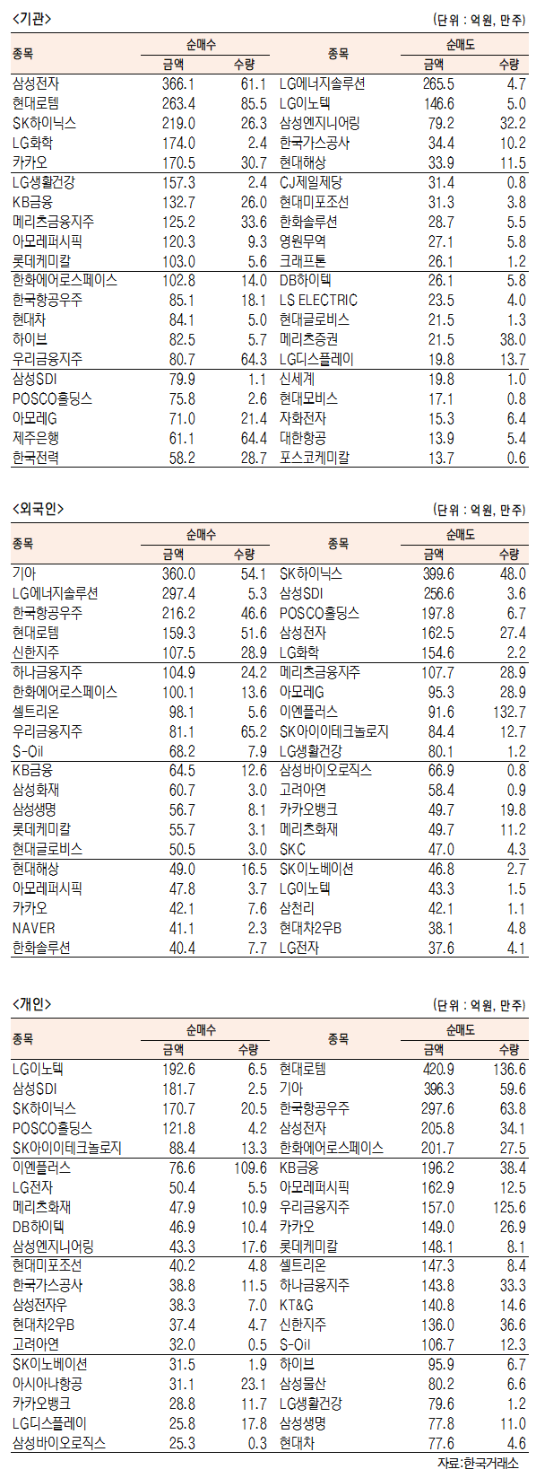 - [데이터로 보는 증시]주간 코스피 기관·외국인·개인 순매수·순매도 상위종목(11월 21일~25일)