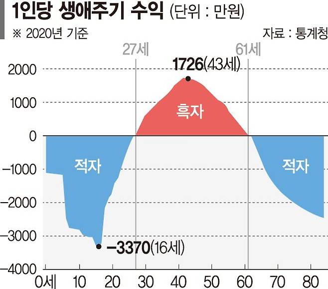 우리나라 1인당 생애주기 적자는 16세 때 3370만원으로 최대를 기록한 후 27세부터 노동소득이 소비보다 많은 흑자에 진입하는 것으로 나타났다.