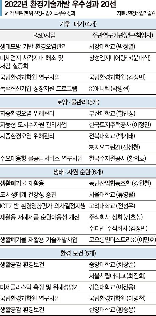 29일 환경부와 기술원에 따르면 환경 현안을 해결하는 환경 기술에 대한 국민의 관심을 높이고 환경 연구자의 자긍심을 고취하기 위하여 2018년부터 매년 우수성과 기술 20선을 선정하고 있다.