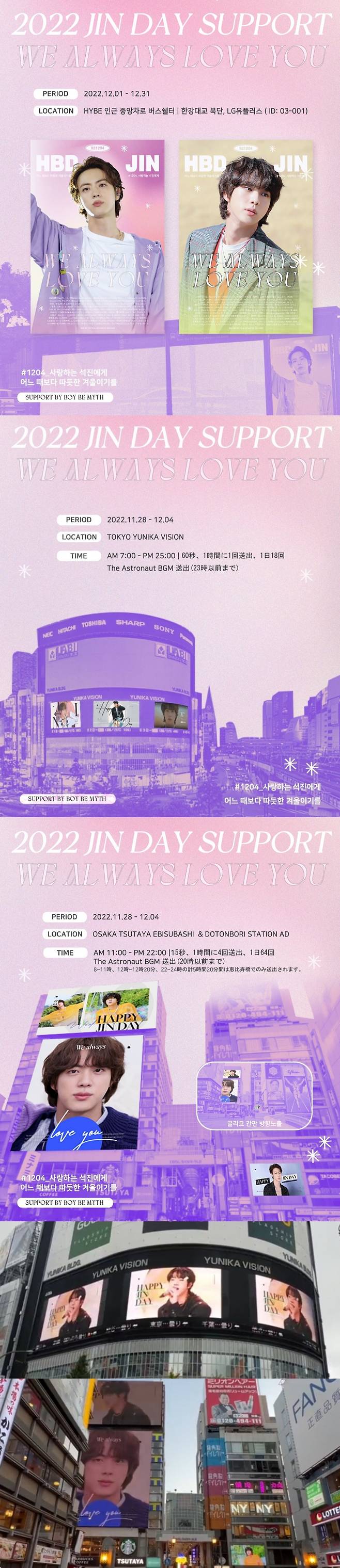 네번째 서포트는 OSAKA에 위치한 츠타야 에비스바시 히트비젼(TSUTAYA EBISUBASHI)과 도톤보리 스테이션(Dotonbori Station AD)에서 진의 생일축하 광고 영상을 진행한다고 전해 팬들의 축제감을 더했다.