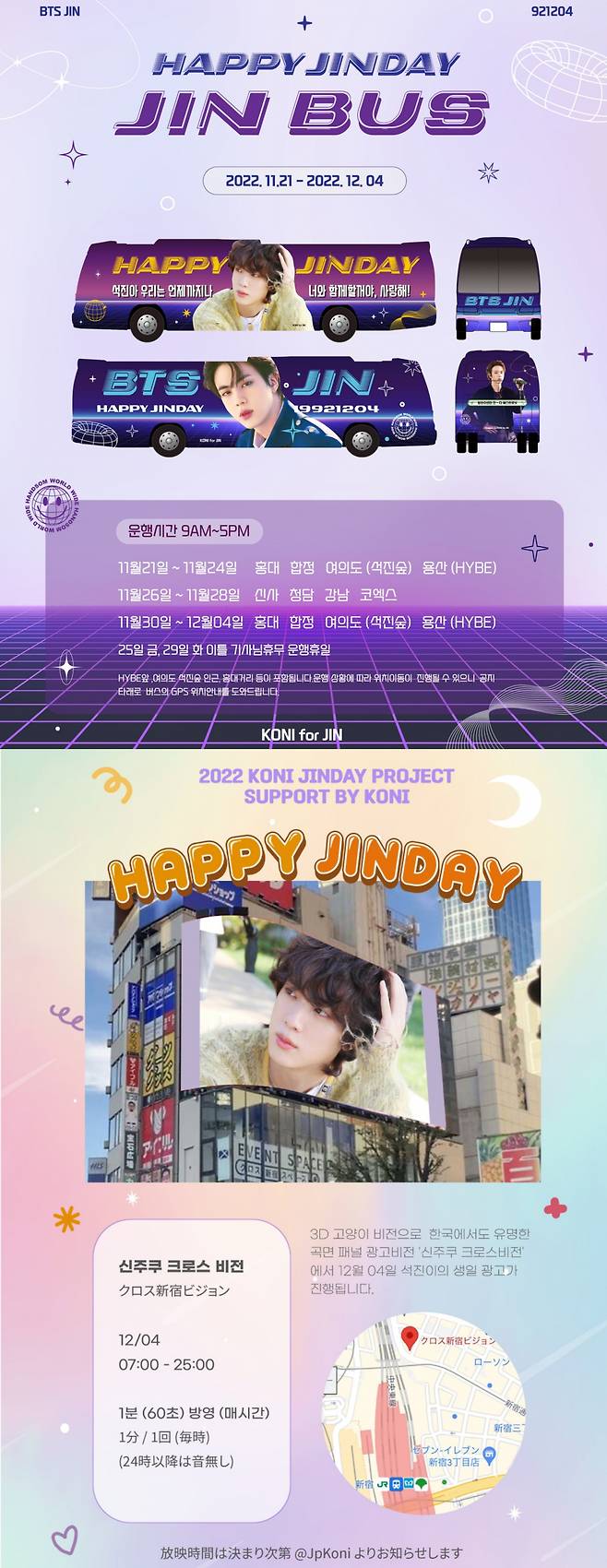 진의 오랜 팬계정인 '코니'(KONI)도 11월 21일부터 12월 4일 2주간 진의 생일을 축하하는 랩핑버스가 운행된다.