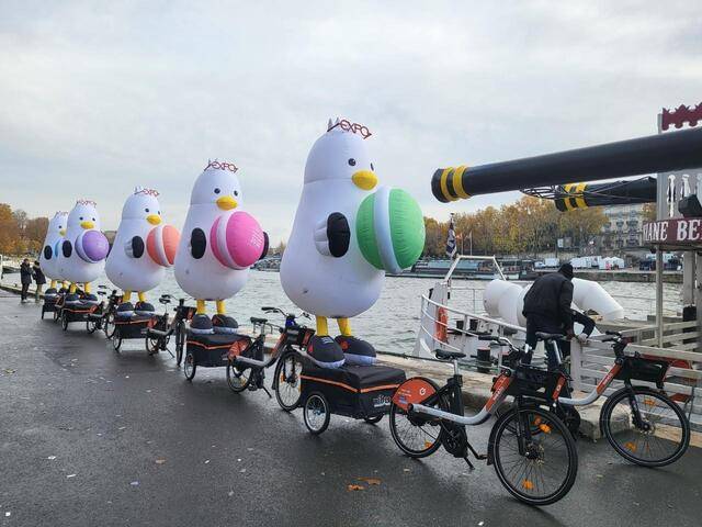부산시의 캐릭터인 '부기' 인형들이 머리에 '엑스포(EXPO)'라고 적힌 안경을 얹고 프랑스 대표 과자 마카롱을 안은 채 28일(현지시간) 파리 시내를 지나고 있다.