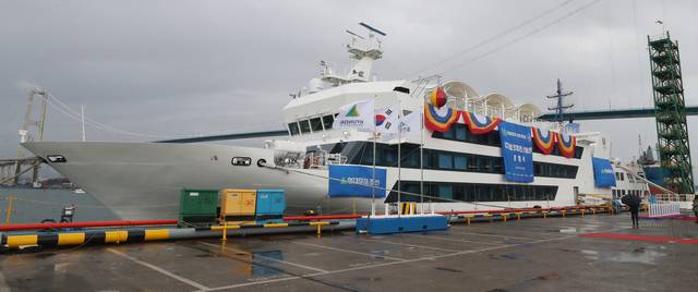 울산태화호 명명식이 29일 울산시 동구 현대미포조선 안벽에서 열리고 있다. 산업통상자원부와 울산시가 448억원을 투입해 건조된 이 선박은 국내 첫 직류 기반 전기추진선이다. 연합뉴스