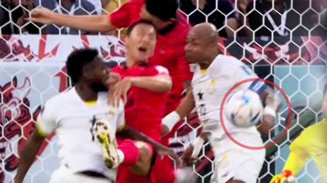 김민재 선수가 걷어낸 공이 가나 아이유의 손에 맞고 떨어졌고 이것을 살리수가 집어넣었는데, 주심은 핸드볼에 고의성이 없다고 판단해 골을 인정했습니다.