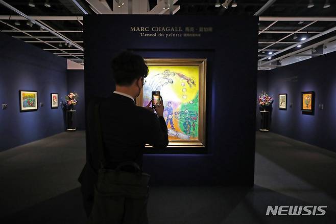 [홍콩=뉴시스] 박진희 기자 = 29일 크리스티 홍콩 프리뷰 전시장인 홍콩 컨벤션 센터(HKCEC)를 찾은 관람객이 '샤갈 특별 경매 전시관'을 돌아보고 있다. 크리스티 홍콩은 올해 마지막 경매로 추정가 총 12억~17억 홍콩 달러(한화 약 2040억) 규모의 총 5개 경매를 펼친다. 2022.11.29. pak7130@newsis.com