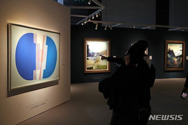 [홍콩=뉴시스] 박진희 기자 = 29일 크리스티 홍콩 프리뷰 전시장인 홍콩 컨벤션 센터(HKCEC)를 찾은 관람객이 이성자 작가의 Cite Janvier73' 작품을 살펴보고 있다. 크리스티 홍콩은 올해 마지막 경매로 추정가 총 12억~17억 홍콩 달러(한화 약 2040억) 규모의 총 5개 경매를 펼친다. 2022.11.29. pak7130@newsis.com