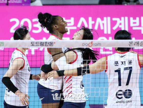 2022-2023 프로배구 V리그 여자부 흥국생명과 GS칼텍스의 경기가 29일 오후 인천 삼산월드체육관에서 열렸다. 5세트 모마가 결정적인 서브에이스를 성공시키고 강소휘와 포옹하고 있다.