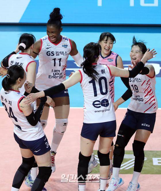 2022-2023 프로배구 V리그 여자부 흥국생명과 GS칼텍스의 경기가 29일 오후 인천 삼산월드체육관에서 열렸다. 풀세트 접전 끝에 승리한 GS칼텍스 선수들이 기뻐하고 있다.