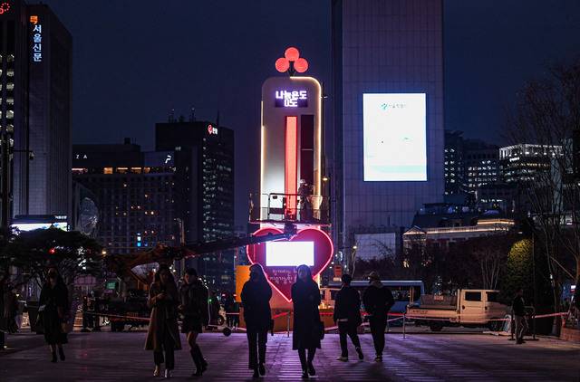 29일 밤 서울 종로구 광화문광장에 ‘사랑의 온도탑’이 불을 밝히고 있다. 이날 설치된 사랑의 온도탑은 다음 달 1일 제막식이 열릴 예정이다. 사랑의 온도탑은 매년 설정한 모금액이 1%씩 달성될 때마다 1도씩 올라간다.
