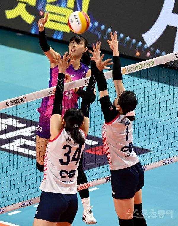 29일 인천 삼선월드체육관에서 ‘2022-2023 도드람 V리그’ 인천 흥국생명과 서울 GS칼텍스의 여자부 경기가 열렸다. 흥국생명 정윤주가 GS칼텍스 블로커를 피해 스파이크를 날리고 있다.