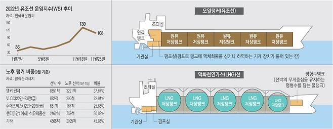 신년에는 국내 조선소들이 밀려드는 ‘오일탱커(유조선)’ 주문으로 바쁜 한 해를 보낼 가능성이 높아지고 있다. 러시아·우크라이나 전쟁으로 국제 원유 항로에 대대적인 변화가 일고 있는 데다, 노후 유조선 교체 수요까지 몰릴 것으로 예상되면서다. 올 한 해 액화천연가스(LNG) 운반선 시장을 휩쓸며 오랜 불황의 늪에서 벗어난 한국 조선업이 내년에는 탱커 수주로 날개를 달 것으로 기대된다.