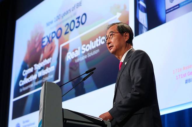[서울=뉴시스] 김명원 기자 = 한덕수 국무총리가 29일(현지시간) 프랑스 파리 제171차 국제박람회기구(BIE) 총회에서 부산의 2030 세계박람회 경쟁 프리젠테이션(이하PT)에 마지막 연사로 참여해 인류 당면과제 해결을 위한 솔루션 플랫폼으로서의 부산 세계박람회를 강조하고 개최 당위성을 역설했다. (사진=총리실 제공) 2022.11.29. photo@newsis.com *재판매 및 DB 금지