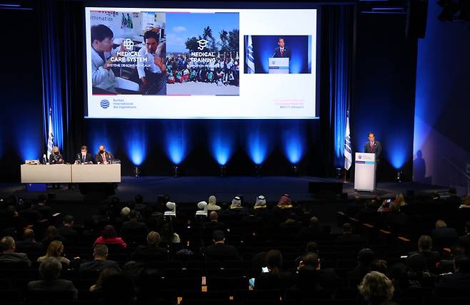 [서울=뉴시스] 김명원 기자 = 한덕수 국무총리가 29일(현지시간) 프랑스 파리 제171차 국제박람회기구(BIE) 총회에서 부산의 2030 세계박람회 경쟁 프리젠테이션(이하PT)에 마지막 연사로 참여해 인류 당면과제 해결을 위한 솔루션 플랫폼으로서의 부산 세계박람회를 강조하고 개최 당위성을 역설했다. (사진=총리실 제공) 2022.11.29. photo@newsis.com *재판매 및 DB 금지