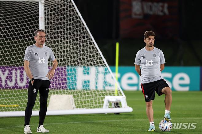 [도하(카타르)=뉴시스] 조성우 기자 = 파울루 벤투(왼쪽) 감독과 세르지우 코스타 수석코치가 29일(현지시간) 오후 카타르 도하 알 에글라에 마련된 대한민국 축구대표팀 트레이닝센터에서 훈련을 지켜보고 있다. 2022.11.29. xconfind@newsis.com