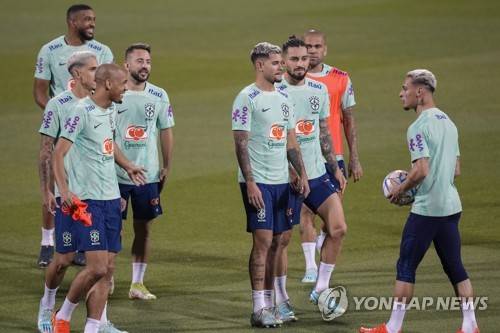 Brazilian players attend a training session at the Grand Hamad stadium in Doha, Qatar, Tuesday, Nov. 29, 2022. Brazil will face Cameroon in a group G World Cup soccer match on Dec. 2. (AP Photo/Andre Penner)