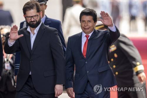 Chilean President Gabriel Boric, left, and Peru's President Pedro Castillo, wave to journalists as Castillo arrives to La Moneda presidential palace in Santiago, Chile, Tuesday, Nov. 29, 2022. (AP Photo/Esteban Felix)