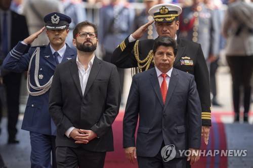 Chilean President Gabriel Boric, left, walks with Peru's President Pedro Castillo who arrives to La Moneda presidential palace in Santiago, Chile, Tuesday, Nov. 29, 2022. (AP Photo/Esteban Felix)