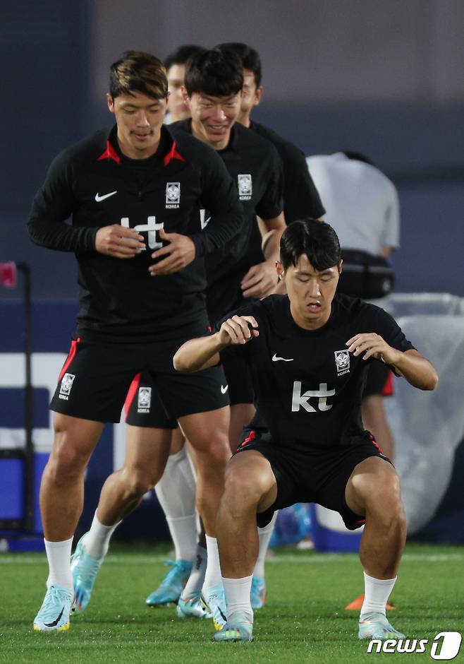 (도하(카타르)=뉴스1) 이광호 기자 = 대한민국 축구대표팀의 이강인과 황희찬, 황의조 등이 29일 오후(현지시간) 카타르 도하 알에글라 트레이닝센터에서 훈련을 하고 있다. 2022.11.29/뉴스1