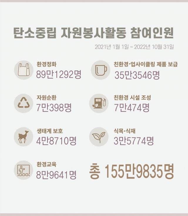 한국중앙자원봉사센터가 실시한 현황조사에 따르면 2021년 1월부터 2022년 10월 말까지 탄소중립 자원봉사활동에 참여한 자원봉사자의 수는 총 156만 명으로 집계됐다. 특히 캠페인 초기 전체 활동 중 71%를 차지했던 환경정화활동의 비중은 2022년 48%로 줄어든 반면 친환경 제품 보급, 자원순환, 식목·식재, 환경교육 등의 활동은 전년 대비 10% 내외로 늘어났다. 환경정화와 보호 중심의 활동에서 온실가스 감축을 중심으로 한 활동 분야의 확장이 일어난 것이다.
