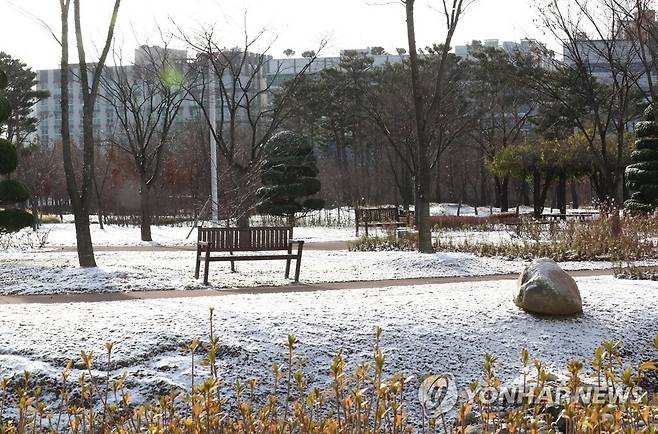 (홍성=연합뉴스) 김소연 기자 = 30일 충남 홍성군 내포신도시 충남도청 인근에 첫눈이 내려 눈이 소복이 쌓여 있다. 2022.11.30