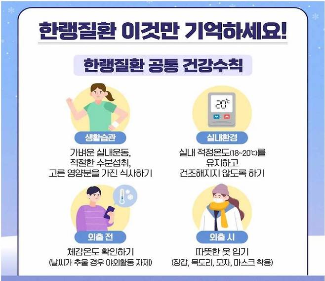 한랭질환 예방을 위해서는 실내 적정온도(18~20도)를 유지하고, 외출 시에는 체감온도를 사전에 확인해 장갑, 목도리, 모자, 마스크 등을 착용하는 게 좋다.