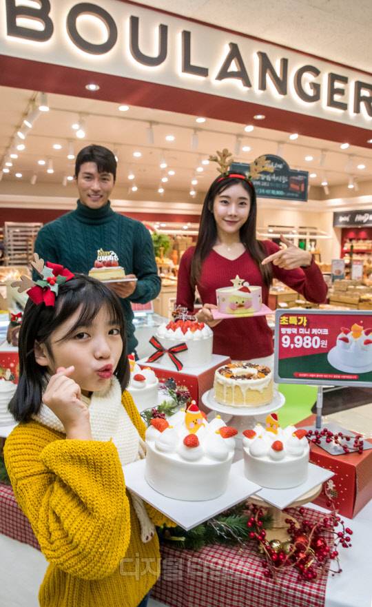 30일 서울 용산구 이마트 용산점 블랑제리 매장에서 열린 신세계푸드 9980원 '갓성비' 크리스마스 케이크 출시 행사에서 모델들이 케이크를 선보이고 있다.
