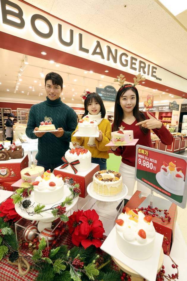 30일 서울 이마트 용산점 신세계푸드 '블랑제리' 매장에서 모델들이 크리스마스 케이크를 선보이고 있다.