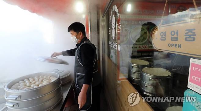 (청주=연합뉴스) 천경환 기자 = 하루 만에 기온이 10도 이상 급락한 30일 충북 청주 내덕동 한 만두가게 앞에 놓인 찜통에서 김이 모락모락 피어오르고 있다. 2022.11.30