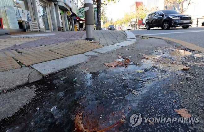 (청주=연합뉴스) 천경환 기자 = 하루 만에 기온이 10도 이상 급락한 30일 청주시 내덕동 도로에 고여있던 물이 얼어붙어 있다. 2022.11.30