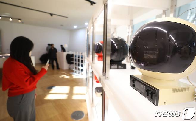 내년 5월 31일까지 열리는 'TELE(텔레) + VISION(비전) 내일의 기억’은 텔레비전의 역사를 DDP 소장품을 중심으로 약 100년 전 초기 진공관식(브라운관) 흑백 텔레비전부터 1969년 아폴로 11호가 달 착륙에 성공하면서 일었던 '우주 붐'을 반영한 비행접시형 TV, 최근의 벽걸이 TV까지 57개의 실물 TV와 관련 디지털 콘텐츠를 선보인다. 2022.11.30/뉴스1