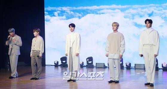 그룹 위앤유(WeNU) 박찬효, 정이든, 한선우, 윤희찬, 지성환(왼쪽부터)이 30일 오후 서울 강남구 일지아트홀에서 진행된 위앤유 첫 데뷔 앨범 '하루하루' 발매 기념 쇼케이스에 참석해 타이틀곡 '하루하루' 무대를 선보이고 있다.