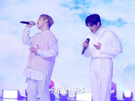 그룹 위앤유(WeNU) 윤희찬, 지성환(왼쪽부터)이 30일 오후 서울 강남구 일지아트홀에서 진행된 위앤유 첫 데뷔 앨범 '하루하루' 발매 기념 쇼케이스에 참석해 타이틀곡 '하루하루' 무대를 선보이고 있다.